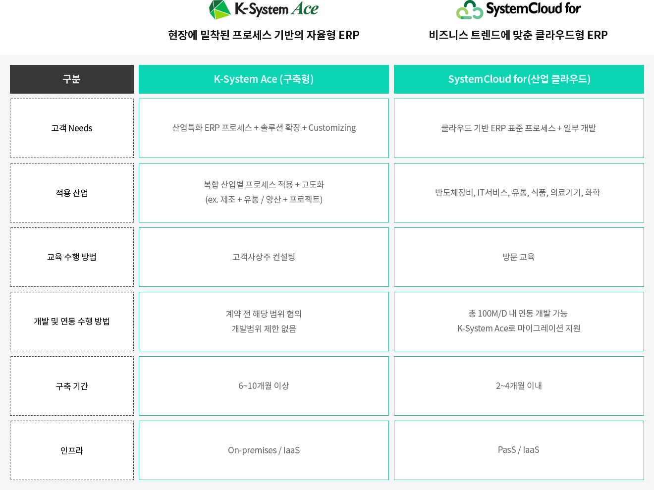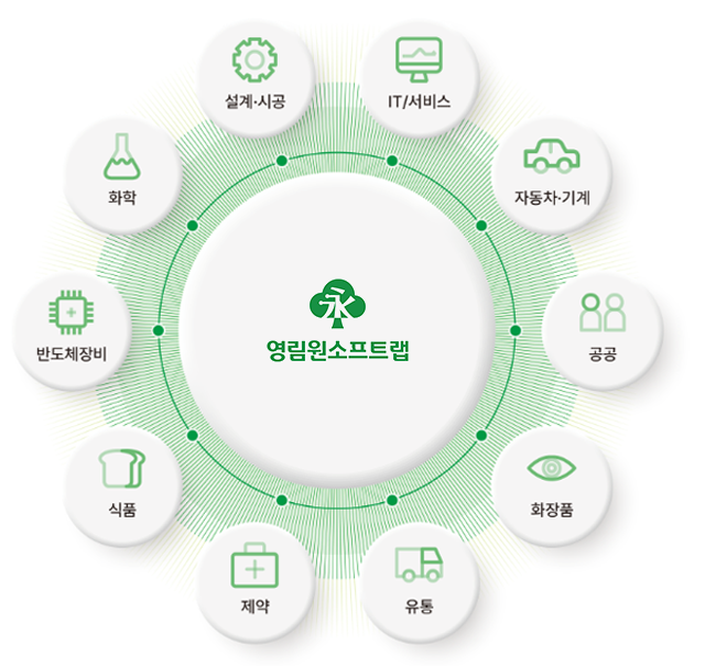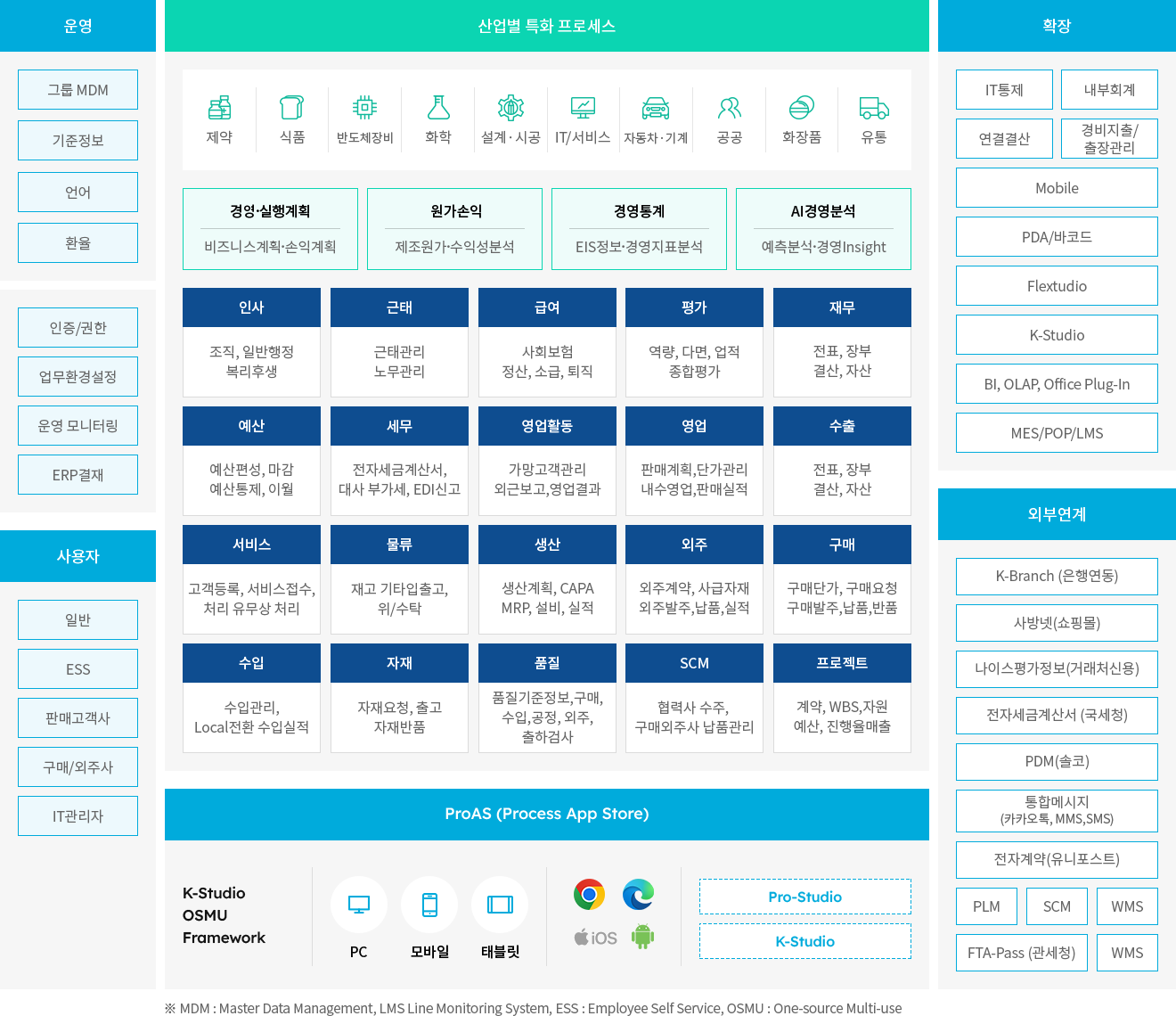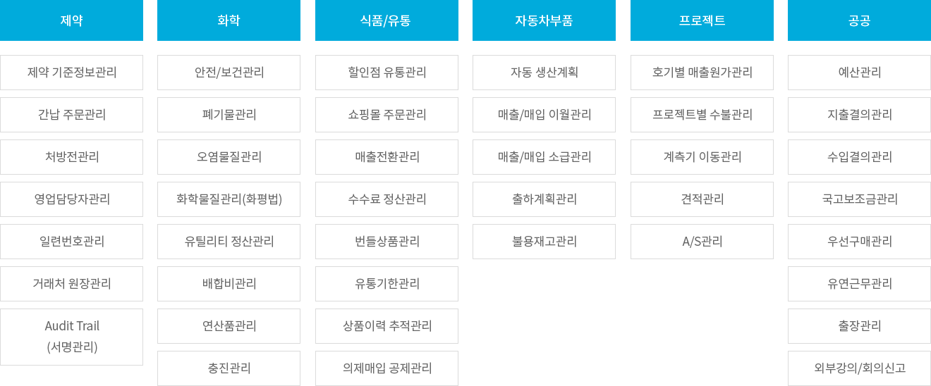 - 제약/화학/공공/식품/유통 등 특수 산업군에서는 산업군별 필수 업무 프로세스를 포함한 특화 패키지 제공